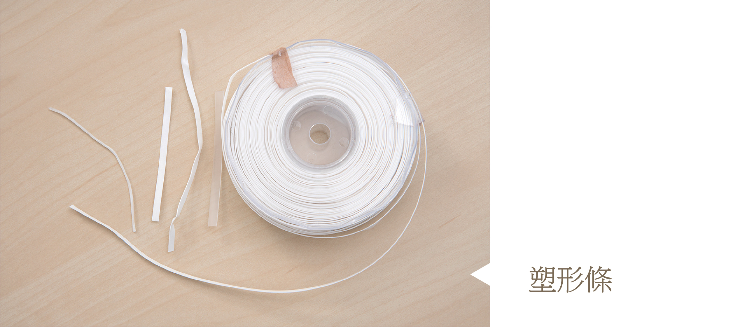 眼罩遮光度佳的關鍵二在於塑形條,因應不同鼻樑、鼻子輪廓不同很難達到符合每個人的需求,所以置入塑型條在眼罩裡,由於眼罩會有長時間使用的情況,在軟硬度上要考量到舒適度,太硬會有疼痛感,太軟服貼度有限,因此在測試時替換了10幾種材質及形狀,如扁的、寬的、細的、軟的都進行測試,也要考量到長期凹折會不會斷掉或失去彈性的問題,所以每個細節都不可輕忽。