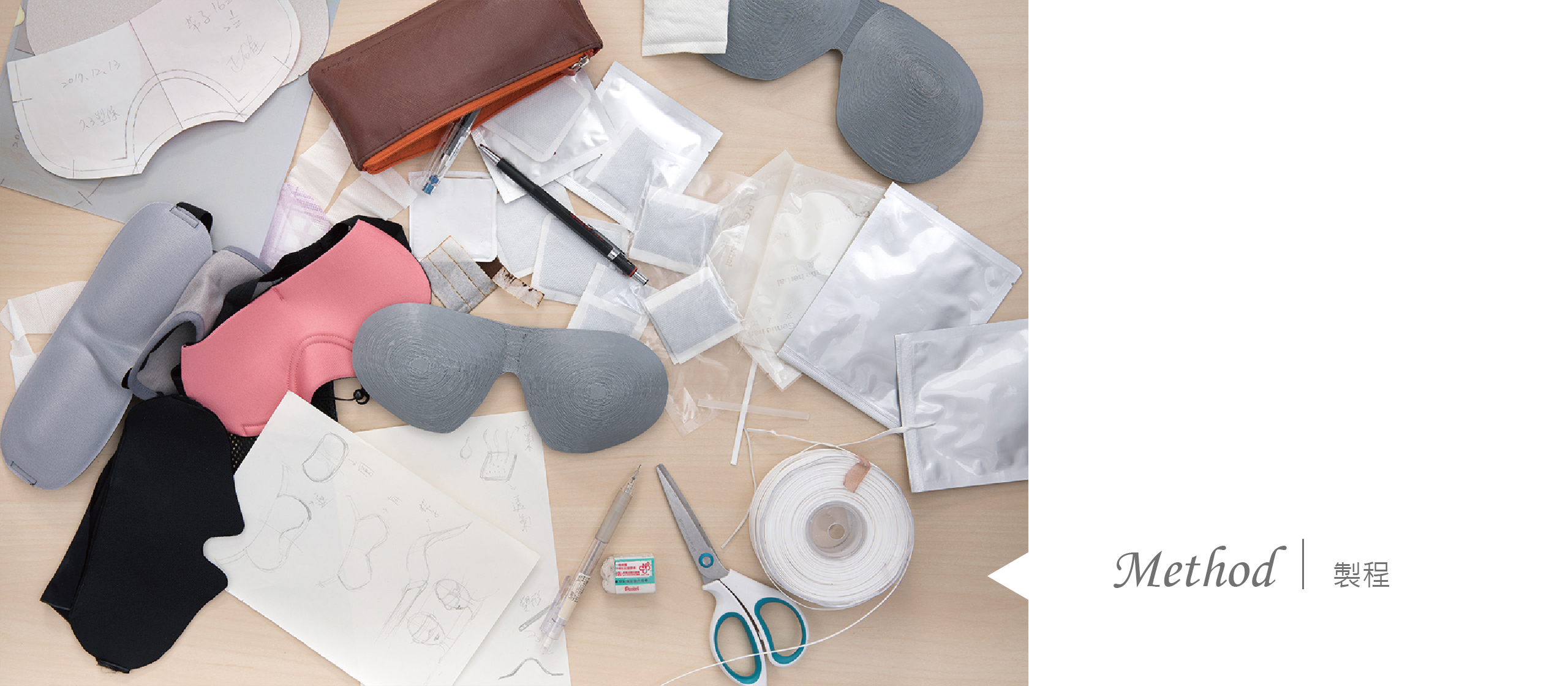首先針對眼罩的遮光度,為了達到高遮光效果,眼罩的曲線及服貼度很重要,因為每個人的臉形骨骼發展的不同,光從手繪線稿、電腦製圖、打版剪裁流程超過50次,提供400個以上的樣品供人試戴調整,每個人提出的狀況及建議一一記錄下來,最困難的就在眼睛、鼻子及顴骨的曲線及結構設計如何讓眼罩的服貼度提高,讓遮蔽光源達到最佳,於是我們決定以幾何曲線概念的流線型,不僅整體外觀俐落好看,除了素色基本元素,還結合創意、趣味、新穎的設計構圖在眼罩布面上,讓眼罩不只功能性,還可作為生活創意送禮自用的絕佳好物。