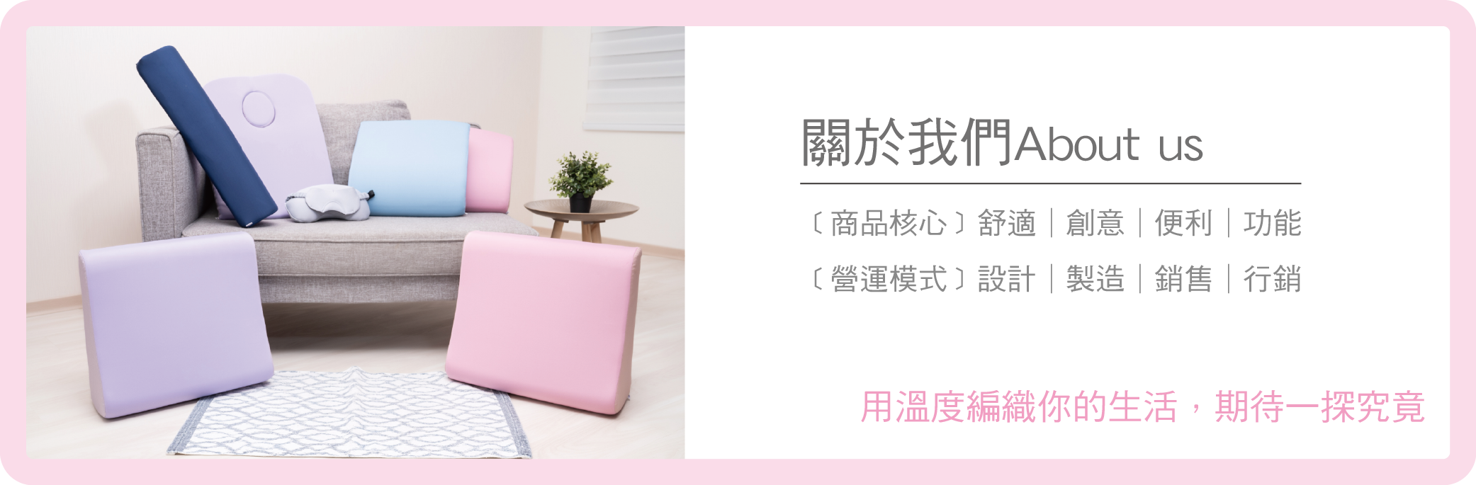 而後陸續開發出多元性商品,含SPA美容枕、舒腰枕、睡眠枕、旅遊枕、生活用品、穿飾等商品,從頭到腳周全考量,不僅符合人體工學,對於布料選擇及使用,都希望帶給人們輕鬆愉快的體驗。