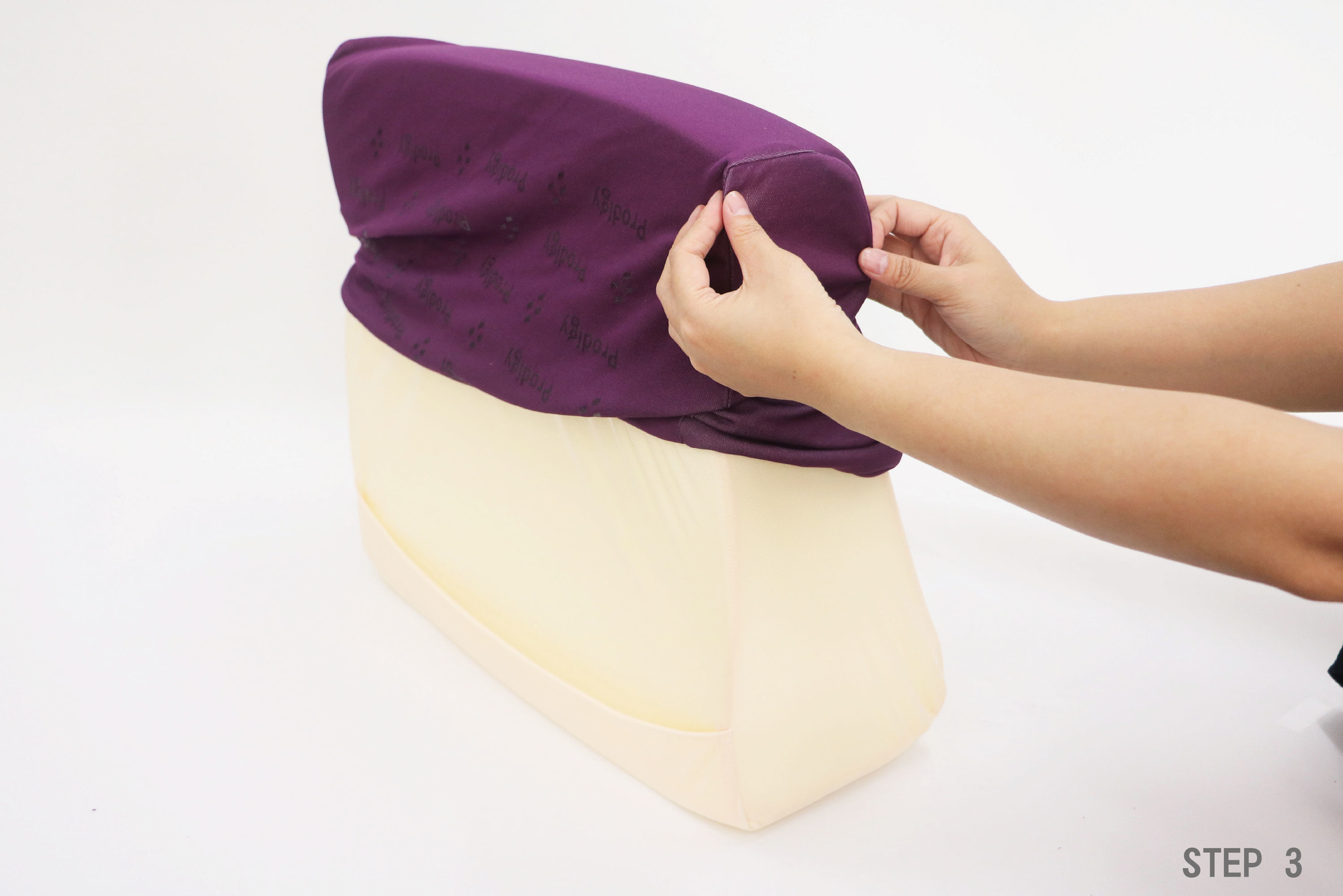 3.套裝時,請將布套由上向下套入枕心,對準側面位置邊捲邊穿上。(請注意!布套的剪裁有曲線及平面之分別,以免裝錯要拆除重裝)