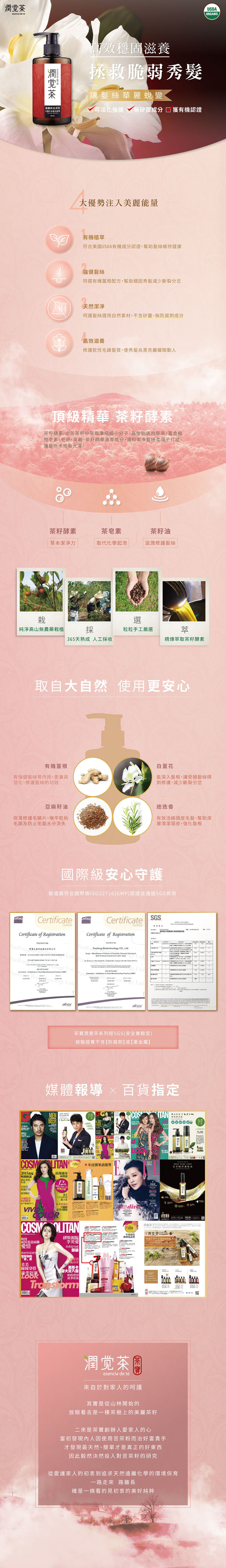 將台灣珍貴天然茶籽優點結合有機薑根/有機迷迭香菁華優越的養護能力,溫和照顧頭皮及修護受損脆弱易斷髮絲,並含多種純草本萃取配方,豐盈秀髮、穩固髮根減少頭髮斷裂分岔,讓您擁有健康頭皮及亮麗的秀髮。
