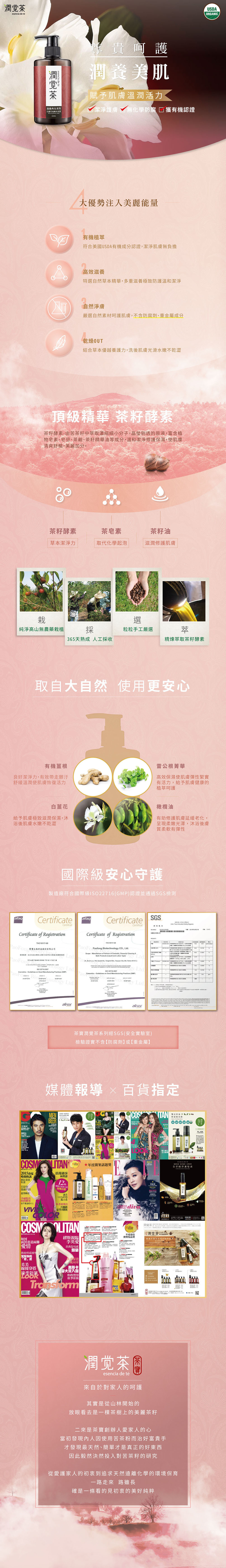 將台灣珍貴天然茶籽優點及茶樹、綠茶菁華優越結合,並富含多種草本植萃成份,健康肌膚調理油脂配方,維持肌膚平衡,沐浴後酵素深層潔淨肌膚無負擔,草本保濕舒緩效果佳,讓肌膚徹底深呼吸。