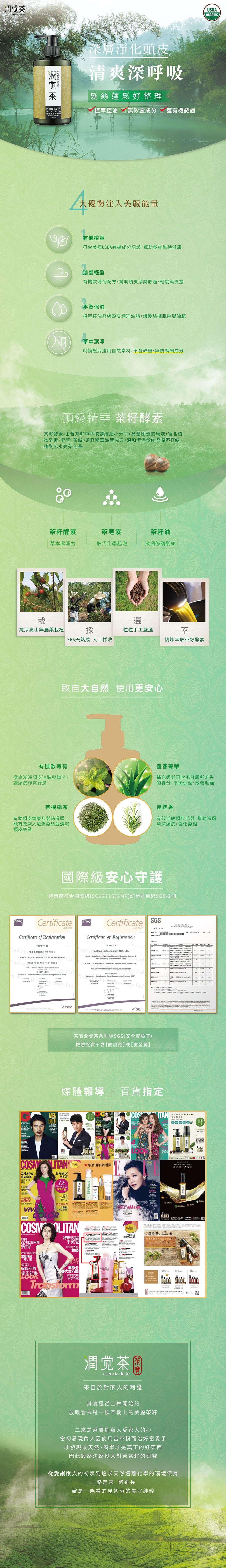 將台灣珍貴天然茶籽優點及茶樹、綠茶菁華優越結合,並珍選多種草本植萃成份配方,使用後髮絲自然蓬鬆好整理,深層淨化頭皮控油效果佳,髮絲自然輕感無負擔,讓頭皮健康深呼吸。