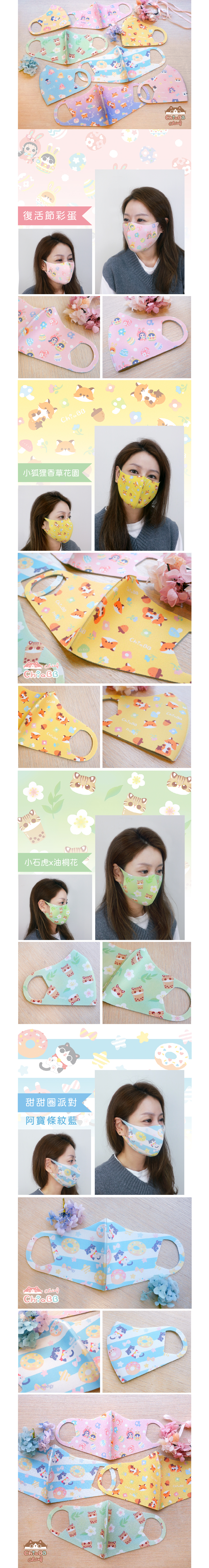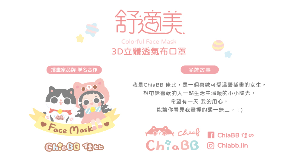 插畫家ChiaBB聯名合作,透過創作角色融入口罩設計中,結合色彩、可愛風療癒人心,大人小孩都能駕馭