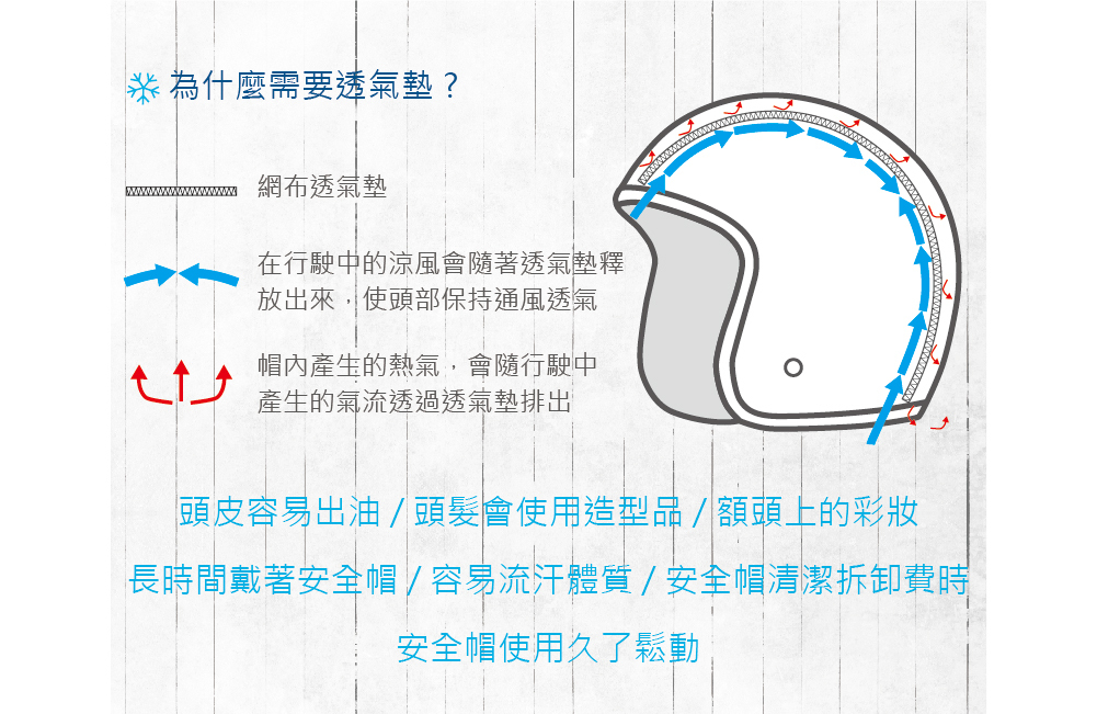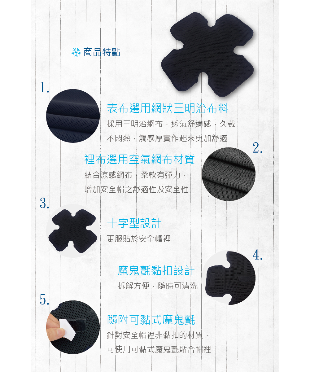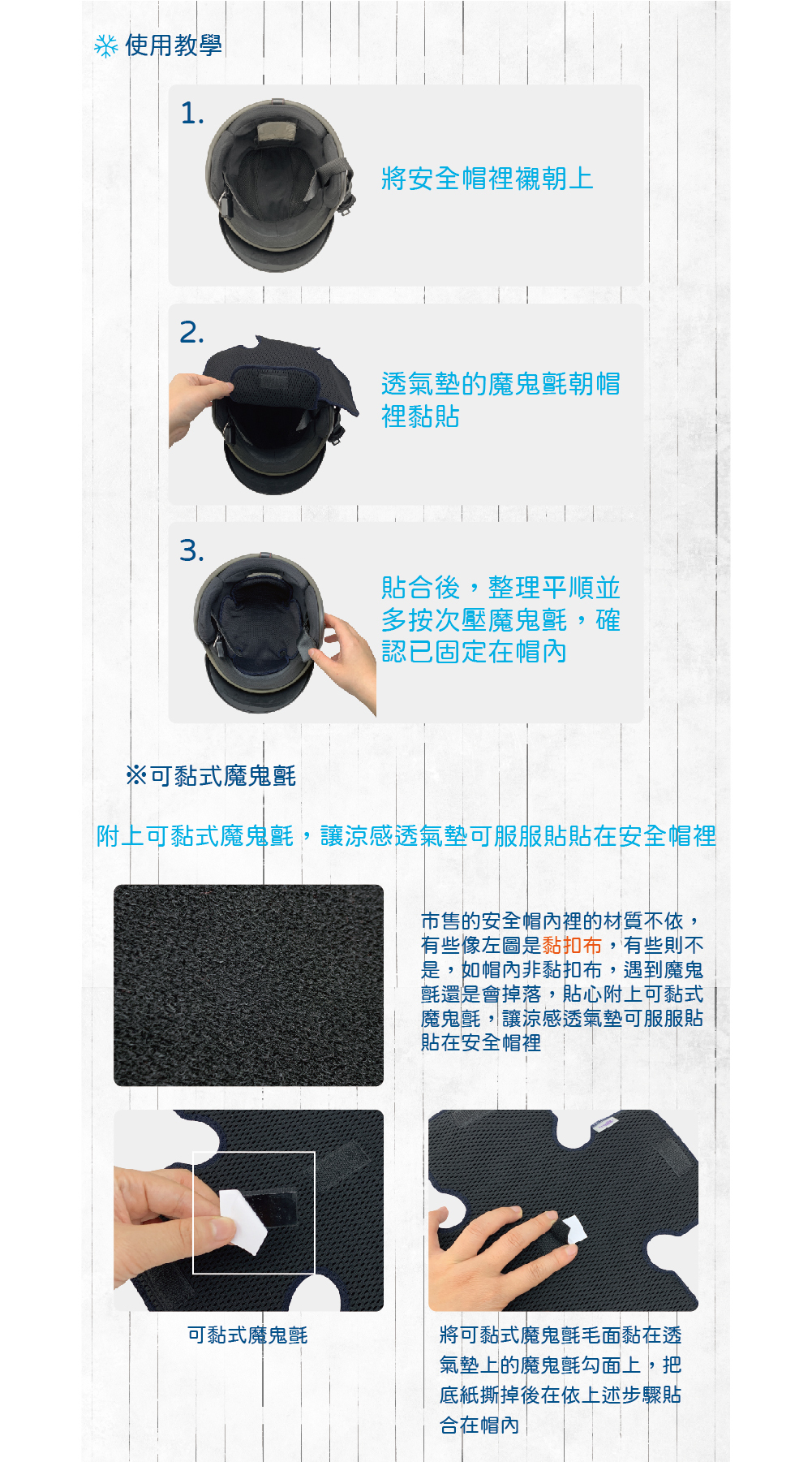 ※隨附魔鬼氈黏扣設計,因應不同材質安全帽黏貼,拆解方便隨時可清洗