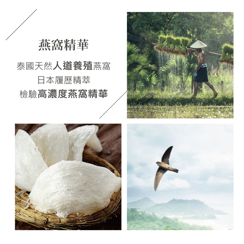 來自泰國天然環境、人道養殖燕窩,日本高等萃取、履歷檢驗高濃燕窩精華,能修護肌膚、使肌膚有光澤、舒緩肌膚不適感、維持肌膚健康。
