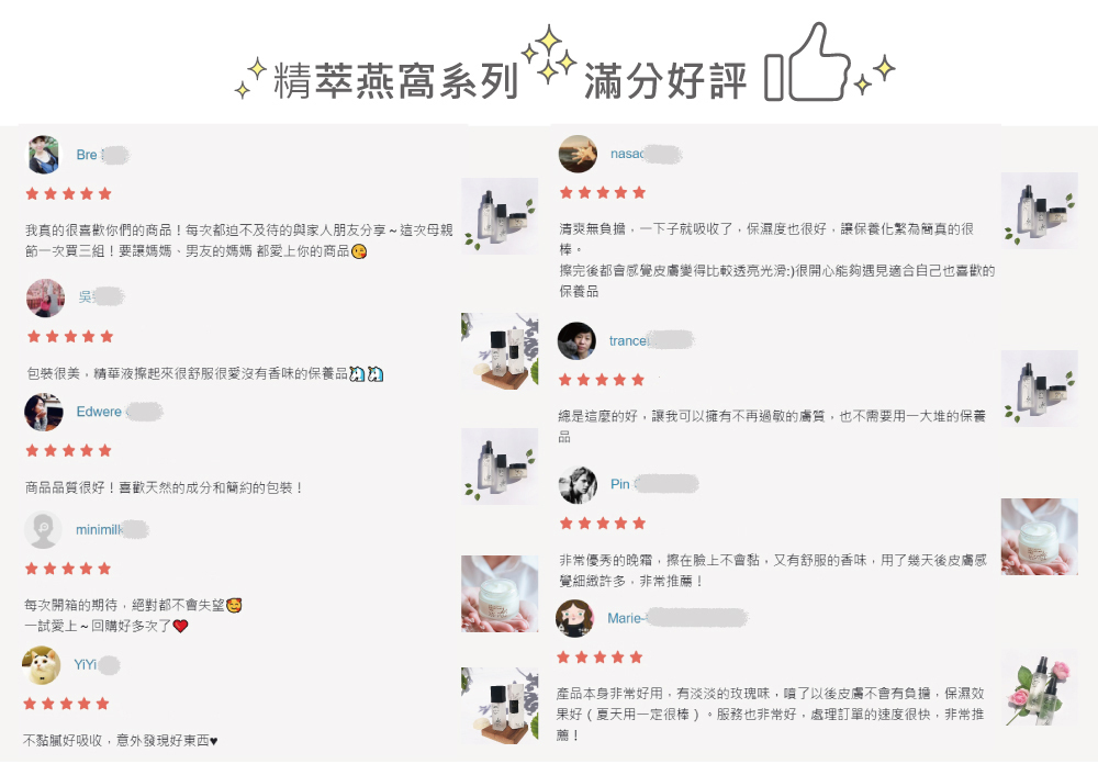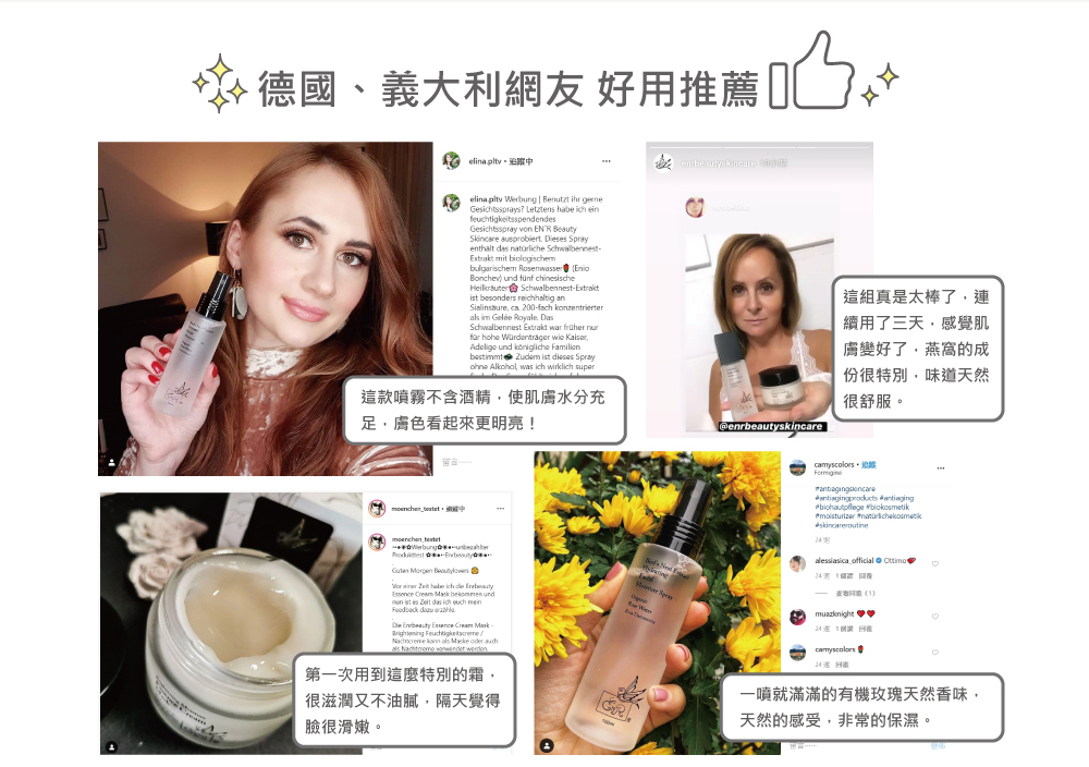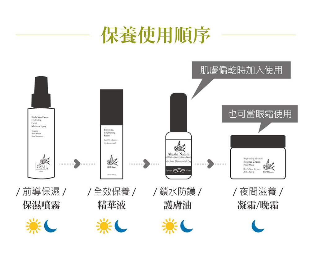 日常基礎保養,穩定健康膚質。保養無需複雜瓶罐。高濃度燕窩精華、提升肌膚彈力的燈塔水母第五型膠原、保加利亞有機玫瑰水、日本獨特5種植萃淨白配方、天然有機成分。能改善肌膚暗沉,重現透亮緊緻光澤感!無酒精、無香精。零負評保養推薦,使用有感!