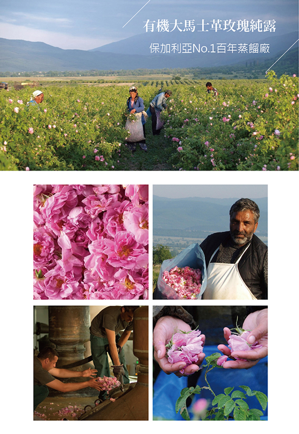 來自「玫瑰王國」保加利亞最古老、百年的玫瑰蒸餾廠,獲得世界知名的有機驗證公司Balkan Biocert 檢驗取得有機認證,並符合美國 USDA 與歐盟 EEC 有機計畫對等認證條件,等於同時取得保加利亞、美國和歐盟三方有機認證,所萃取出精油含量極高的玫瑰純露,是一般市售產品的3 ~ 5倍之高,為國寶級的珍貴純露。