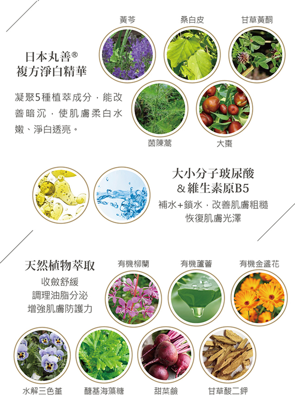 完美凝聚5種漢方植萃成分,能改善暗沉,使肌膚清爽、淨白。