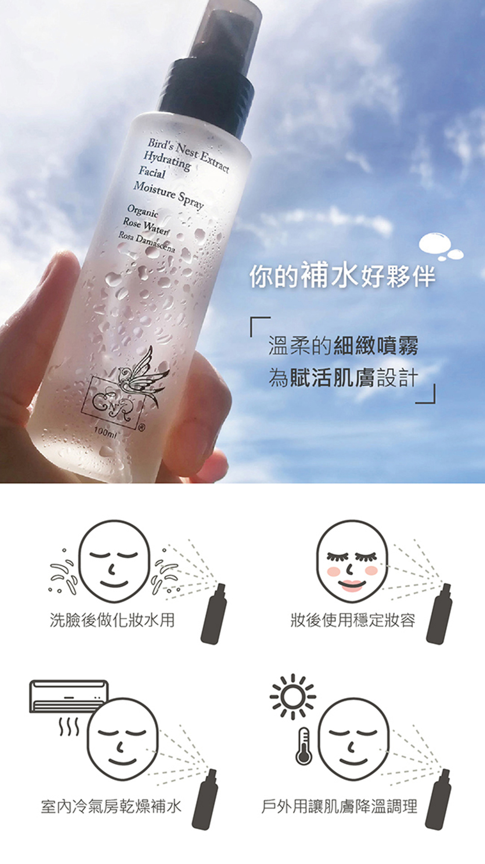 • 距離臉部15-20公分均勻噴灑,輕拍至吸收。