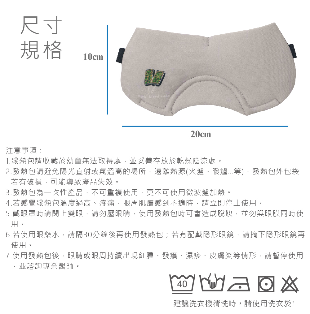 戴眼罩時請閉上雙眼,請勿壓眼睛,使用發熱包時可會造成脫妝,並勿與眼膜同時使用