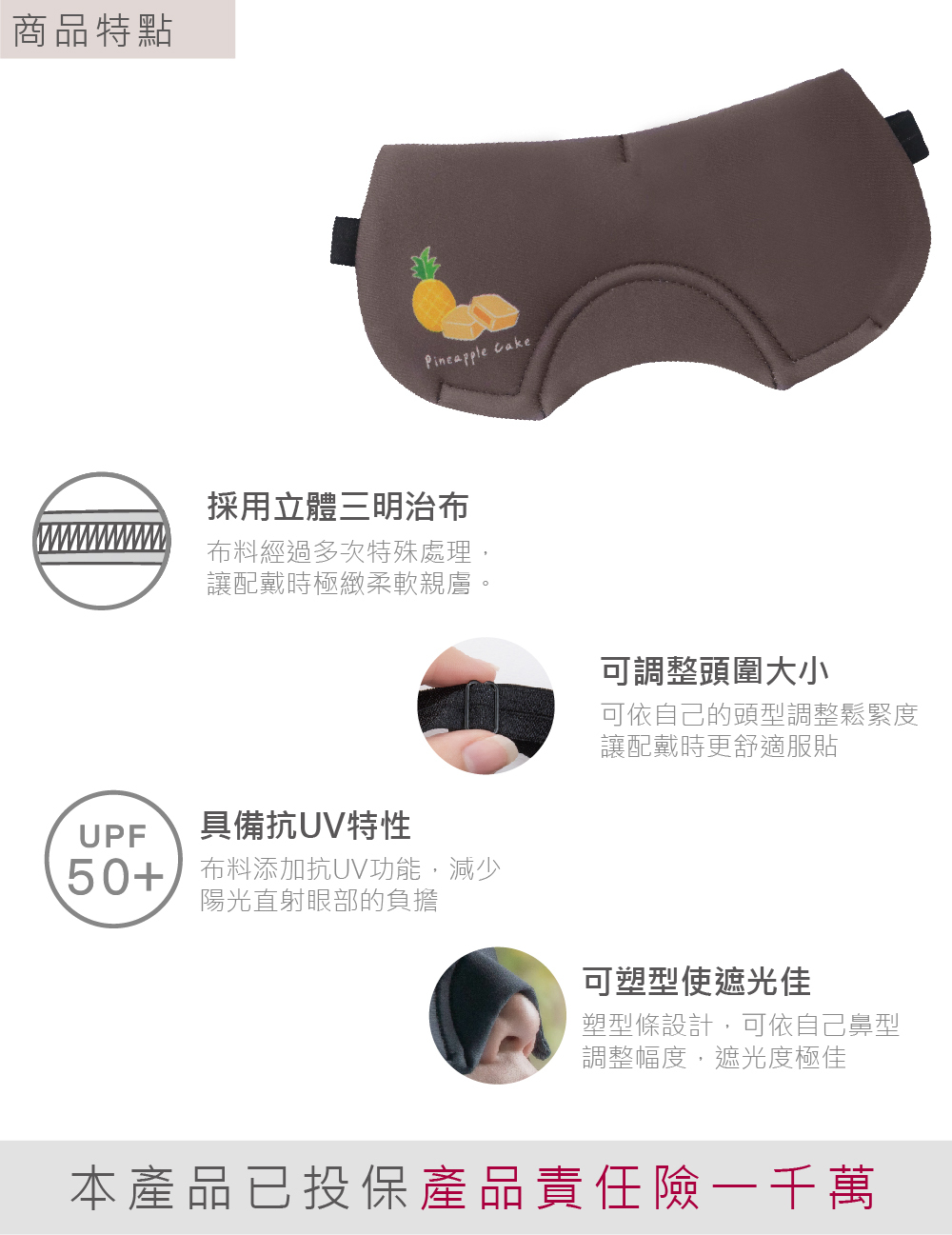 ※鼻翼塑型且可調整頭圍 / 可依個人鼻翼塑型,達到最佳遮光效果;附調整式伸縮帶,使個人頭圍達到極佳鬆緊度