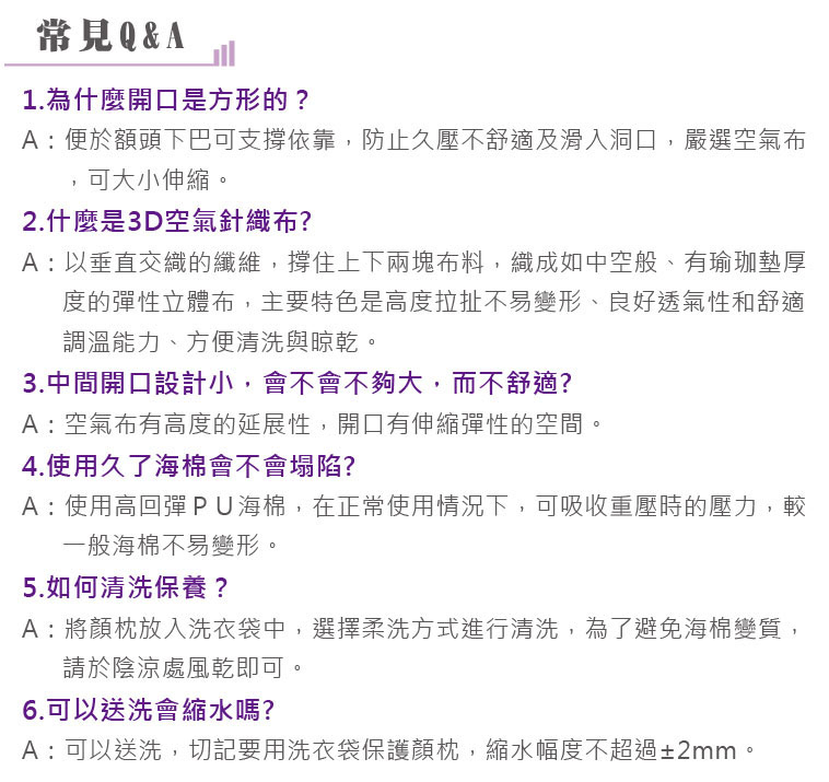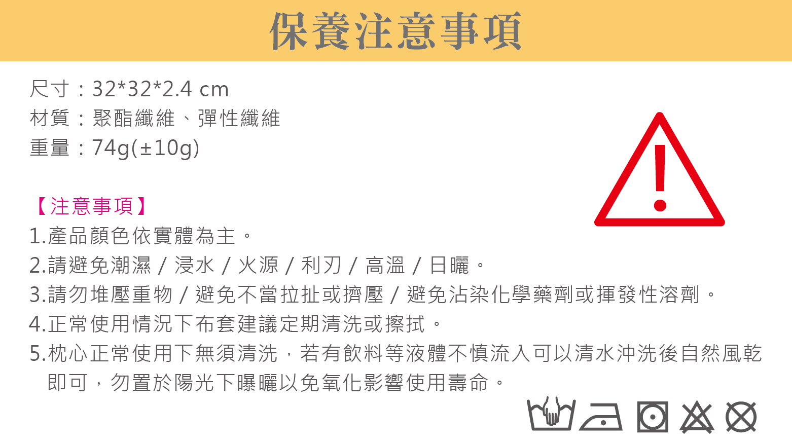⑤ 枕芯正常使用下無須清洗,若有飲料等液體不慎流入可以清水沖洗後自然風乾即可,勿置於陽光下曝曬以免氧化影響使用壽命